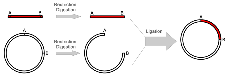 Restriction enzymes are used to excise the gene of interest (the insert) from the parent. The insert is purified in order to isolate it from background junk. A common purification method is gel isolation. Simultaneously, the same or compatible restriction enzymes are used to digest (cut) the destination. The idea behind using the same restriction enzymes is to create complementary sticky ends, which will facilitate ligation later on. A phosphatase (commonly Calf Intestinal Alkaline Phosphatase; CIAP) is also added to prevent self-ligation of the destination vector. The digested destination vector is isolated/purified. The insert and the destination vector are then mixed together with DNA ligase. A typical ratio of insert genes to destination vectors is 3:1; by increasing the insert concentration, self-ligation is further decreased. After letting the reaction mixture sit for a set amount of time at a specific temperature (dependent upon the size of the strands being ligated; for more information see DNA ligase), the insert should become successfully incorporated into the parent plasmid.