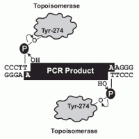 Technical Notes: Taq polymerase has a nontemplate-dependent terminal transferase activity that adds a single deoxyadenosine (A) to the 3´ ends of PCR products. The linearized vector supplied has single, overhanging 3´ deoxythymidine (T) residues. This allows PCR inserts to ligate efficiently with the vector. Topoisomerase I from Vaccinia virus binds to duplex DNA at specific sites and cleaves the phosphodiester backbone after 5'-CCCTT in one strand. The energy from the broken phosphodiester backbone is conserved by formation of a covalent bond between the 3' phosphate of the cleaved strand and a tyrosyl residue (Tyr-274) of topoisomerase I. The phospho-tyrosyl bond between the DNA and enzyme can subsequently be attacked by the 5' hydroxyl of the original cleaved strand, reversing the reaction and releasing topoisomerase.