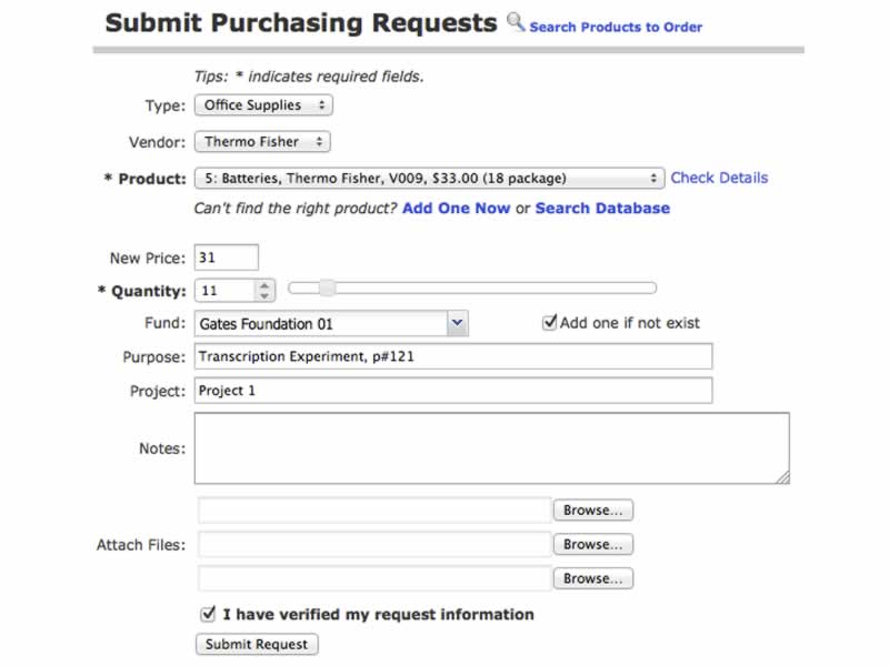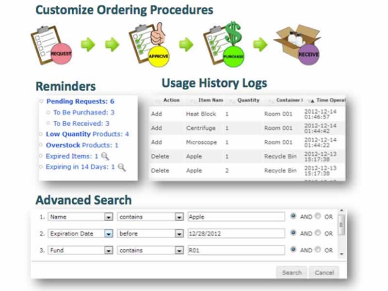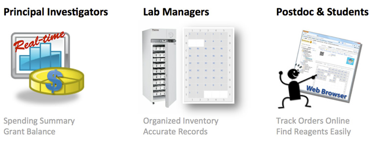 Ever wonder whether your order requests have been processed? Now, you can track progress online. Ever have to delay an experiment because some key reagent is missing? Now you will know where everything is and how much is stored in the lab by searching lab inventory from your browser.