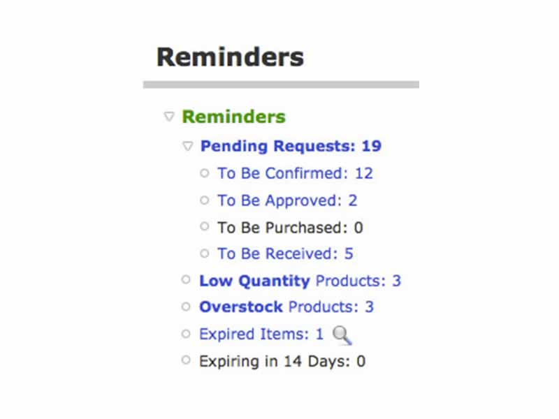 • Review real-time reminders for pending requests, expiration, low quantity and overstock items