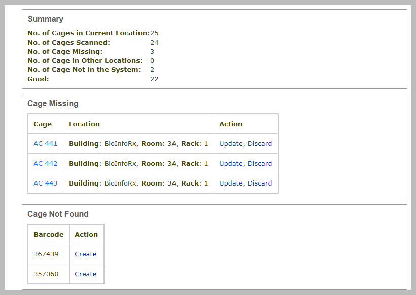 Use the cage census tool and a barcode scanner to scan all cages in a designated area to find missing or extra cages.