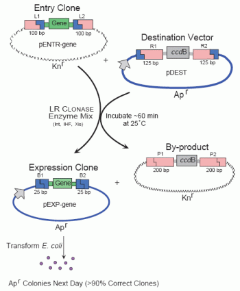 | Takes a sequence of interest in a transcriptionally silent Entry Clone, recombines it with an antibiotic resistant Destination Vector to produce a transcriptionally active Expression